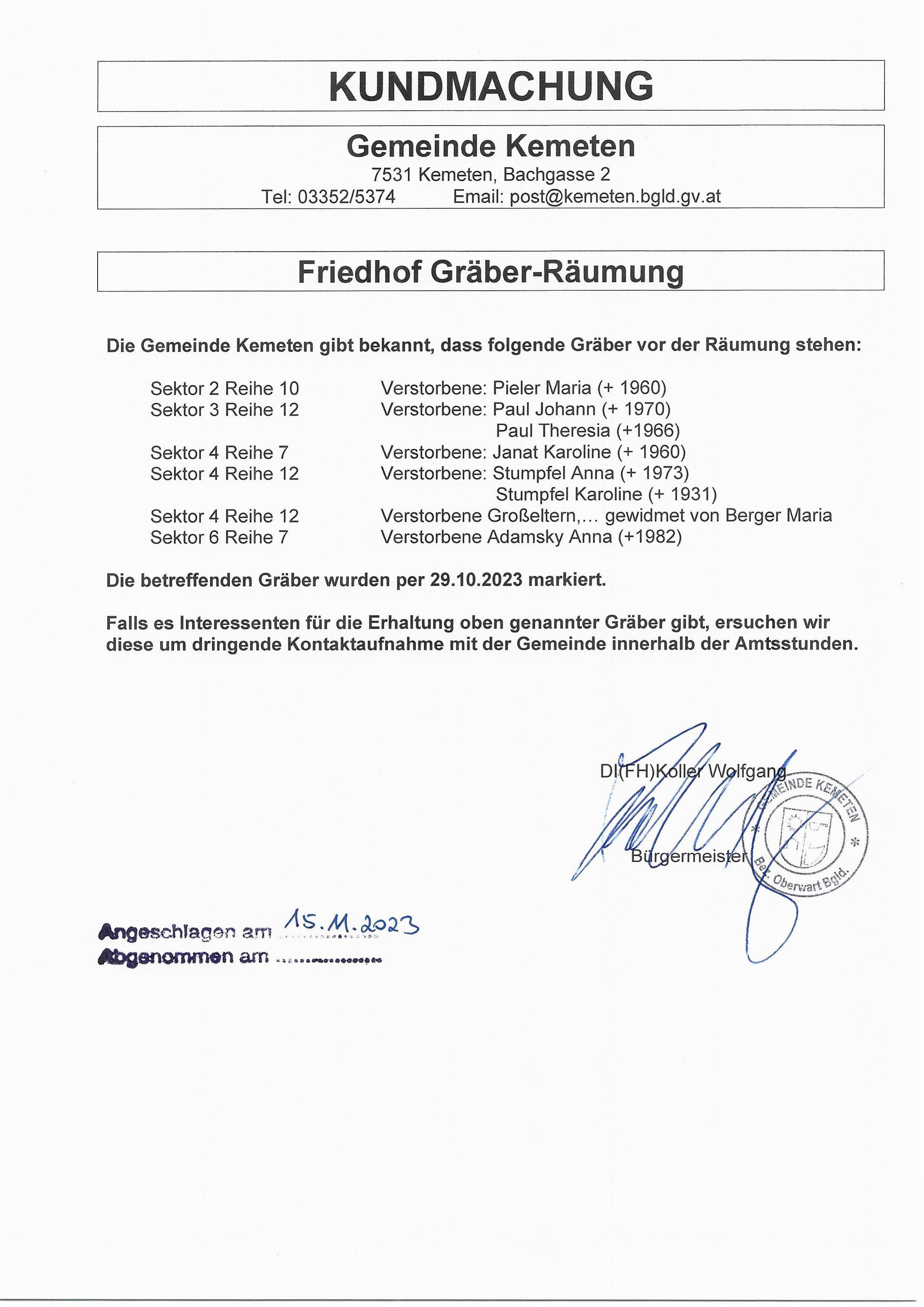 H I N W E I S : Die virtuelle Amtstafel der Marktemeinde Kemeten ersetzt rechtlich N I C H T die wirklich existente (physisch vorhandene) Amtstafel.