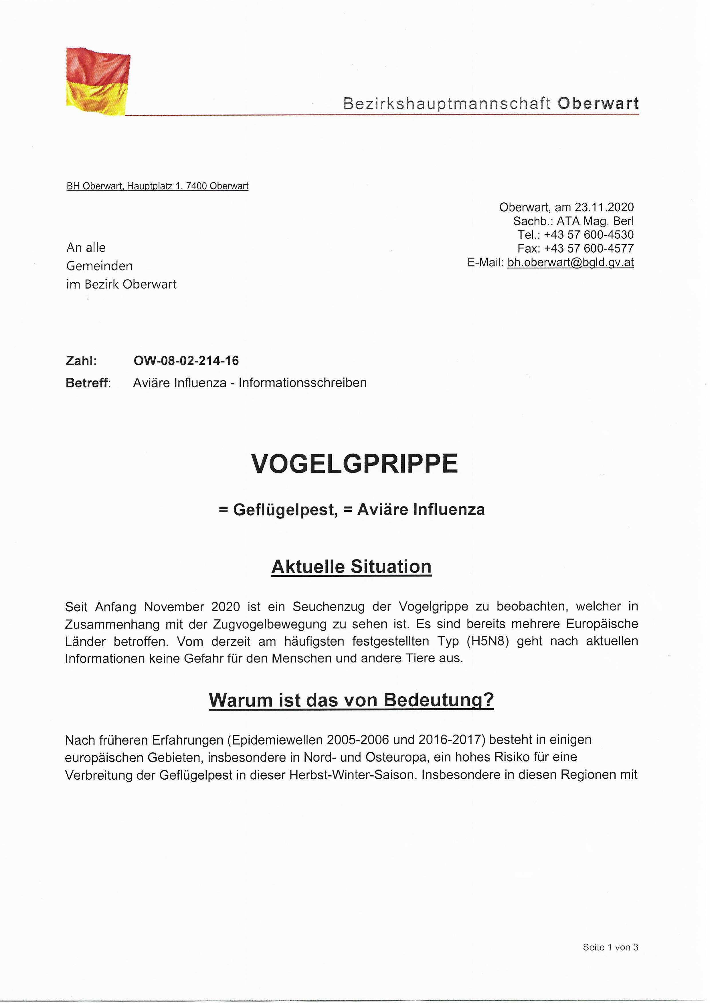 Vogelgrippe - Informationsschreiben BH Oberwart
