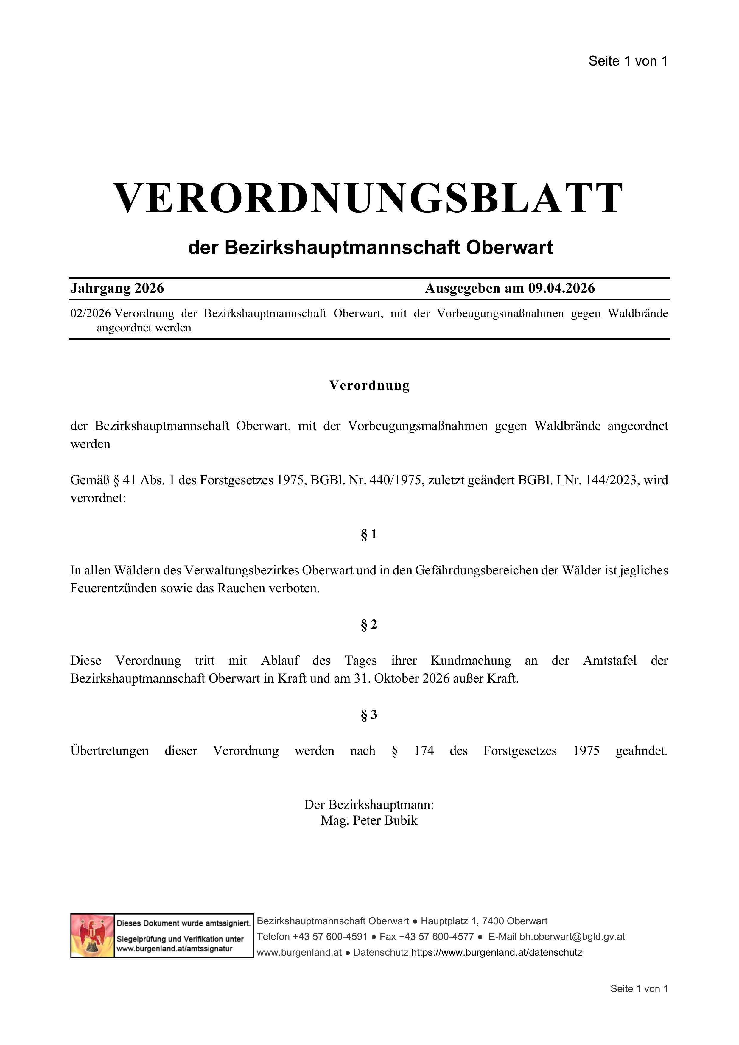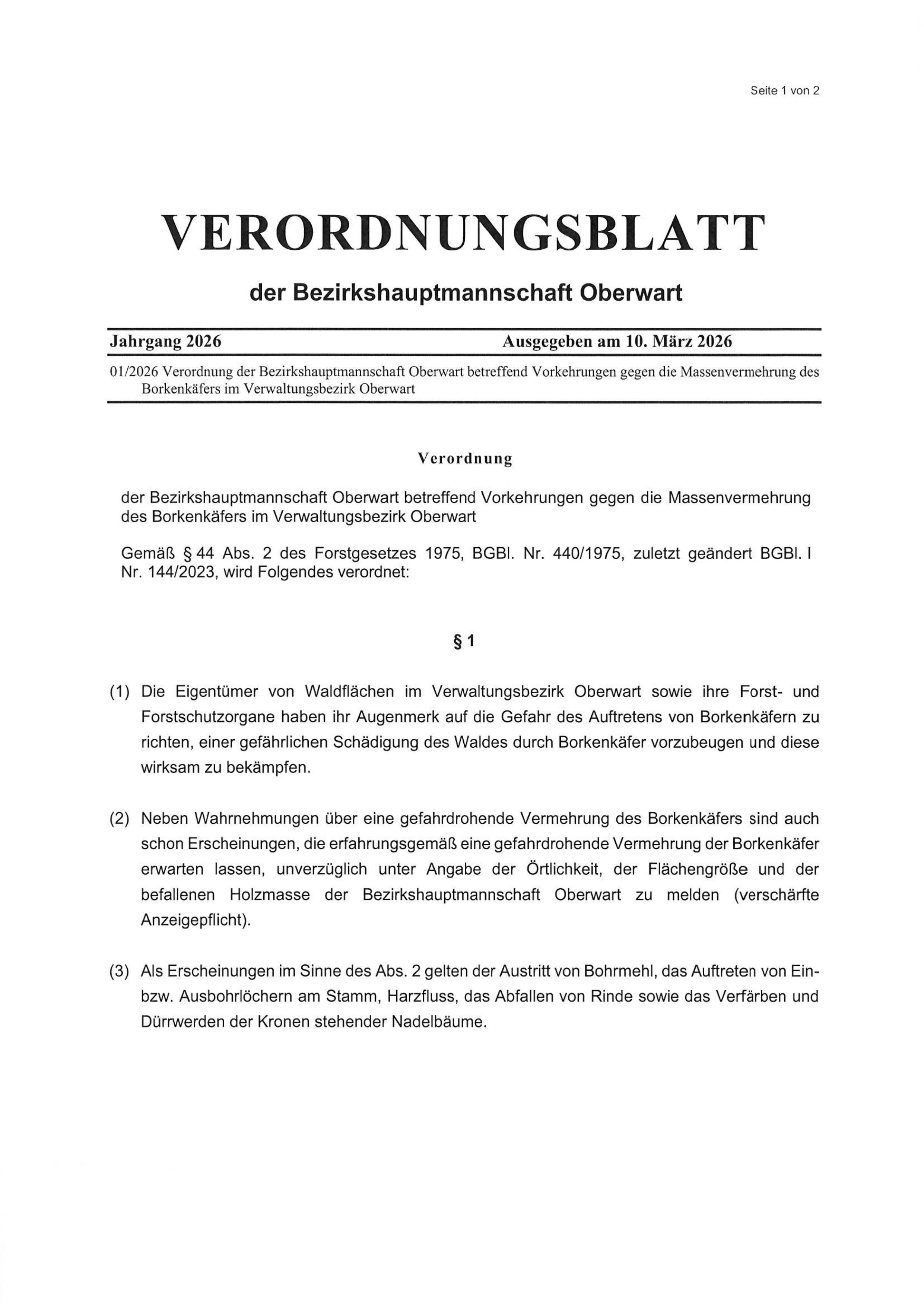 Verordnungsblatt der Bezirkshauptmannschaft Oberwart betreffend Vorkehrungen gegen die Massenvermehrung des Borkenkäfers